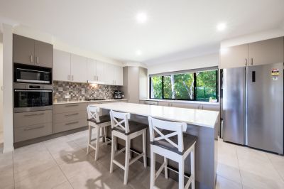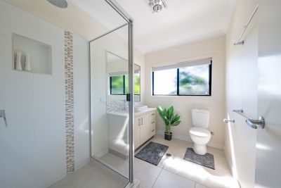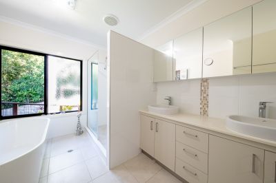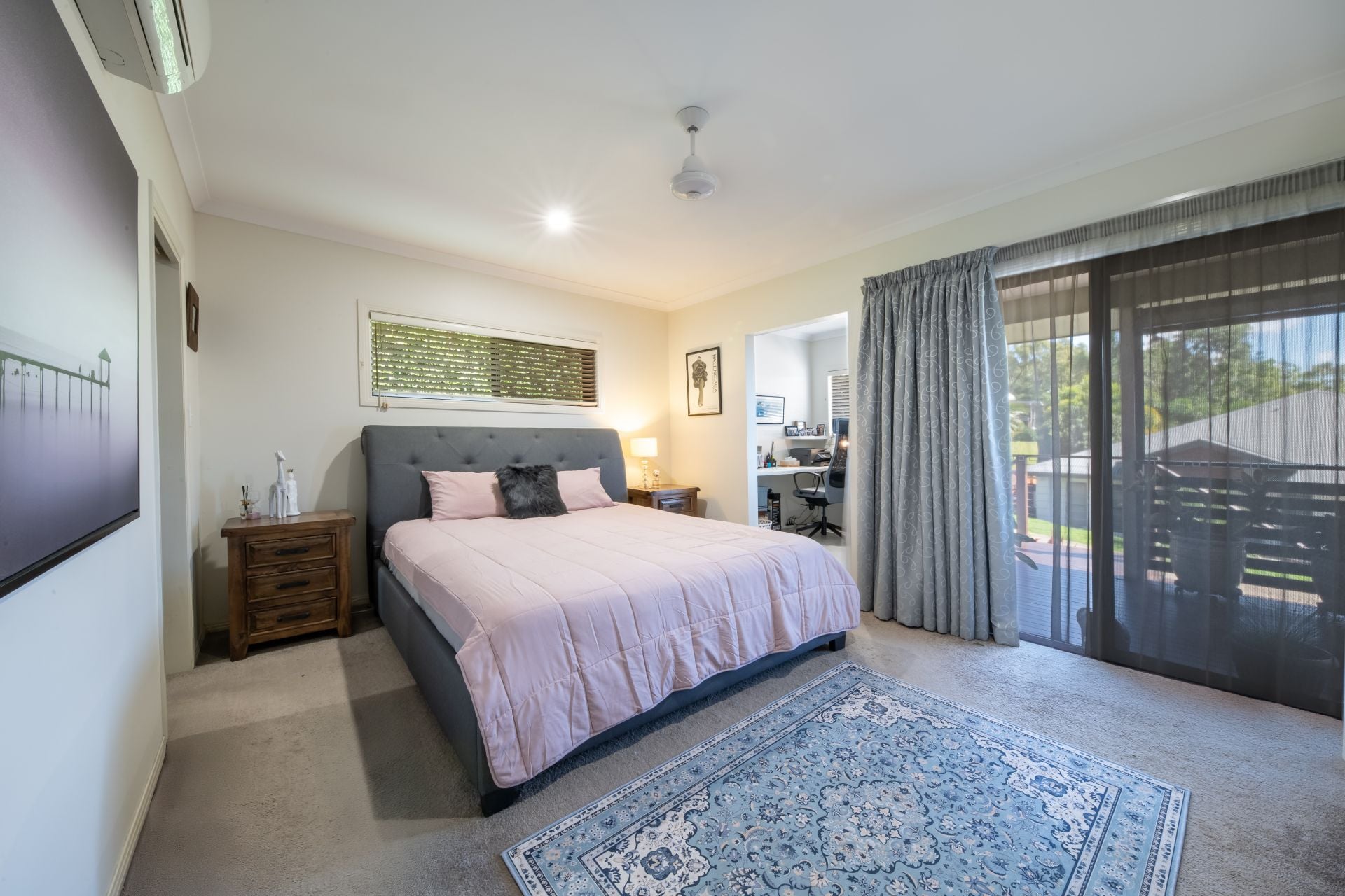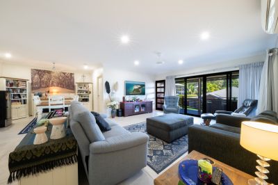 There are three extra-large bedrooms, with the master featuring an ensuite, a sizeable walk-through robe to the bathroom and an adjoining study. With air conditioning, ceiling fans, and window furnishings throughout, comfort is assured all year round. The study offers direct access from the veranda, making it flexible as a home office, nursery, or even a vanity/dressing room.