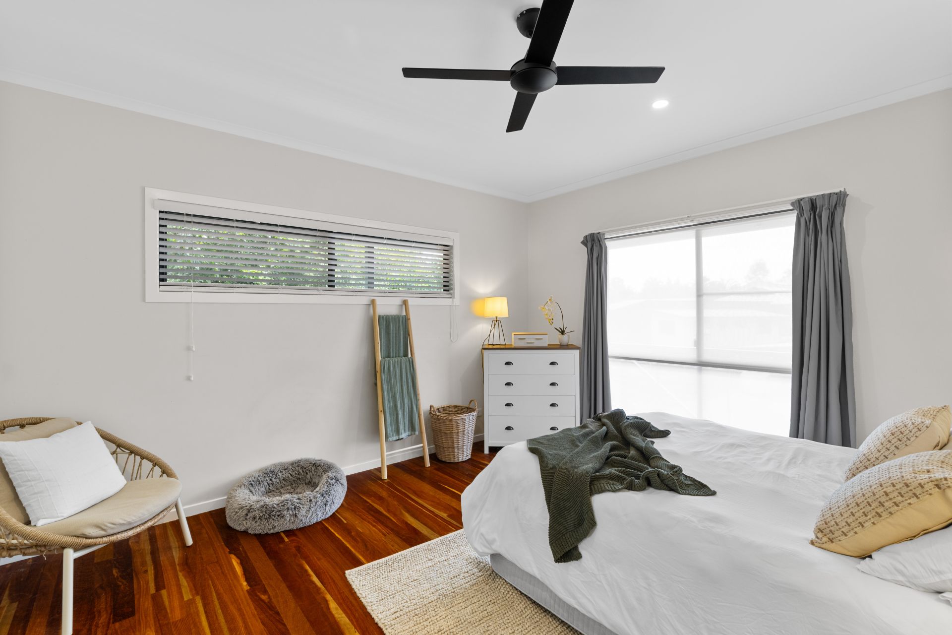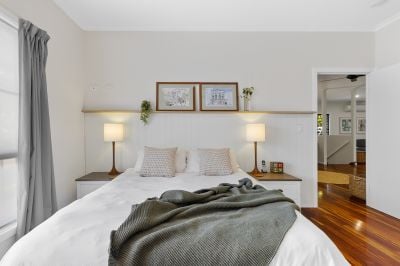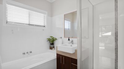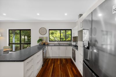 Designed with flexibility in mind, the home boasts two entirely self-contained levels, offering endless possibilities for work-from-home arrangements, guest accommodation, or simply enjoying the luxury of upstairs and downstairs living. Upstairs, polished timber floors flow through the expansive open-plan living and dining area, where large glass sliding doors invite the outdoors in and spill onto an impressively large timber deck that wraps around the rear, side, and front of the home—ideal for entertaining or relaxing with a morning coffee. The upstairs kitchen features gas cooking, while three bedrooms provide comfortable family living, including a master suite with a walk-in robe and ensuite.